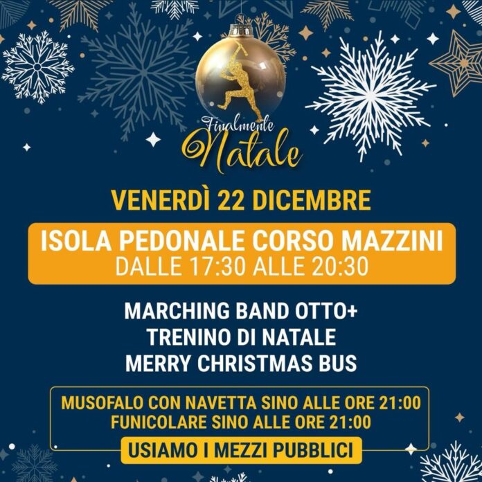 Sarà una due giorni ricca di eventi tra musica, intrattenimento, arte e cultura nel centro storico grazie al programma “Finalmente Natale” promosso dal Comune di Catanzaro. Oggi venerdì 22 dicembre ad animare l’isola pedonale su Corso Mazzini – prevista dalle 17.30 alle 20.30 – sarà la Marching Band Ottopiù, un gruppo di dodici fiati che accompagnerà la passeggiata dei catanzaresi. All’ex Stac prosegue la rassegna Raccontarti che, alle ore 18, vedrà arrivare anche Babbo Natale con gli zampognari Alessio Bressi e Giuseppe Muraca. Nell’ambito dell’evento Genesi-Epifanie contemporanee, alle 21.30 nelle Gallerie del San Giovanni, spazio ancora alla musica con Live Solo: Subconscio + DJ Set R. Vagliolise. Per favorire un più comodo accesso al centro storico, sarà possibile parcheggiare al Musofalo con servizio navette ed usufruire della funicolare fino alle 21. Inoltre, per le vie del centro si snoderà il percorso del suggestivo Trenino di Natale.