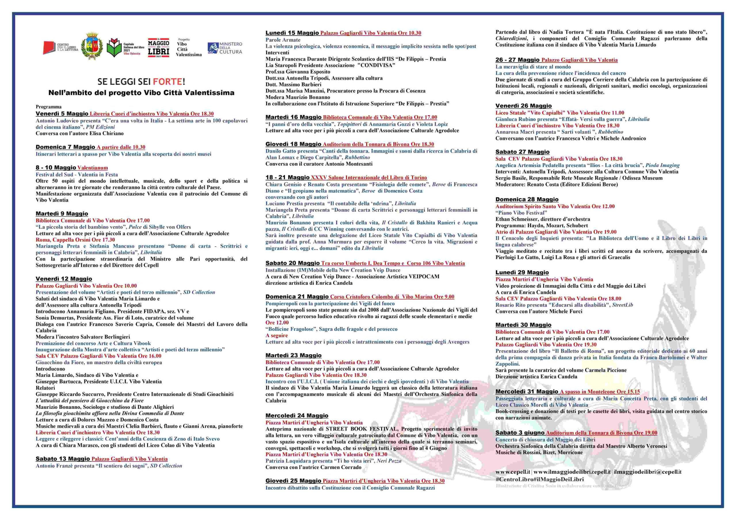 Ad entrare nel dettaglio è l’assessore alla Cultura Antonella Tripodi, che ha curato gli eventi insieme all’assessore alle Attività produttive Carmen Corrado e al delegato allo Sport e Spettacolo Antonio Schiavello. “Abbiamo allestito un programma ricco e vario, che possa essere attrattivo per ogni fascia di età – afferma la Tripodi -, già partito con l’appuntamento della scorsa settimana e col patrocinio che il Comune ha dato al ‘Valentia in Festa’. Ci sarà spazio per i libri dedicati ai più giovani, per i romanzi, i saggi. Ci saranno importanti contributi musicali con l’Orchestra sinfonica della Calabria che ha sede a Vibo e che a Vibo è nata grazie alla Capitale italiana del libro, ci saranno anche ospiti di fama nazionale”. Tra questi, con la direzione artistica di Maria Teresa Marzano, l’appuntamento di venerdì 12 maggio alle ore 19 in piazza Garibaldi con Pietrangelo Buttafuoco che presenterà il suo ultimo romanzo “Sono cose che passano”, edito da La Nave di Teseo; ed il primo romanzo della cantautrice Patrizia Laquidara “Ti ho vista ieri”, edito da Neri Pozza, il 24 maggio alle ore 18.30 in piazza Martiri d’Ungheria.