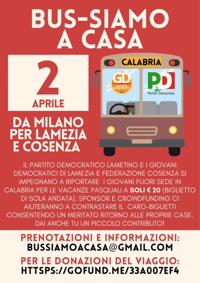 Si chiama “Bus-siamo a casa” ed è l’iniziativa messa in campo dal Partito democratico di Lamezia Terme e Giovani democratici di Cosenza per gli studenti e i lavoratori fuori sede che per il caro biglietti rischiavano di non poter rientrare a casa per le vacanze pasquali. A parlarne, sul suo profilo Facebook, corredando il tutto con un video della partenza e del viaggio dell’autobus, è il segretario cittadino del Pd di Lamezia Terme, Vittorio Paola, che, nel definire questi giovani studenti e lavoratori “il volto bello della Calabria”, sottolinea che l’iniziativa “è un atto per sensibilizzare la politica regionale e nazionale affinché intervenga sul caro biglietti aerei e treni nei periodi festivi, nonostante i grandi investimenti della regione a favore dei vettori che operano negli scali calabresi”.