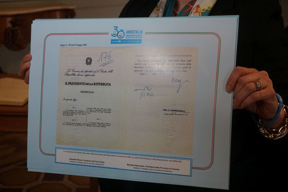 Un momento importante e di alto valore simbolico quello della firma di una copia della Convenzione sui Diritti del Fanciullo, la Legge n.176 del 27 maggio 1991 a firma dell’ex presidente della Repubblica Francesco Cossiga: “L’ho firmata con il Presidente del Consiglio Draghi, con altri ministri, e adesso ho il piacere di firmarla con il presidente della Provincia di Cosenza, come segno di collaborazione in difesa dei diritti dei bambini”, afferma Carmela Pace. Un gesto che sancisce un impegno in nome della cultura dei diritti, e che si proietta in un percorso di crescita e sviluppo non soltanto per i più piccoli, ma per le istituzioni stesse, che sempre di più sono tenute a tutelare quei diritti oggi ampiamente e indegnamente calpestati.