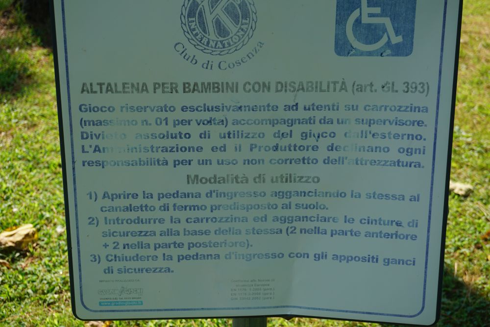 “Il polmone verde della città” lo definisce spesso l’amministrazione che, si narra, intenda unire il Parco Robinson al vicino “Nicholas Green” per creare “il parco inclusivo più grande d’Europa”. Grande, senza alcun dubbio, inclusivo, non esattamente, sicuro ancor meno. Ne è un esempio l’innovativa altalena per bambini con disabilità, con tanto di cartello che ne spiega passo passo l’utilizzo. Peccato che, ad avvicinarsi giusto il tempo di capirne il funzionamento, si può ben notare come quello che dovrebbe essere un simbolo di inclusività e accessibilità, sia invece segno anch’esso di degrado, mancanza di controlli, abbandono totale. L’inclusività che rimane una mera idea e che, anzi, lascerebbe solo tanta delusione in un bambino disabile che volesse andare in altalena. La pedana d’ingresso, che dovrebbe essere chiusa, è invece aperta e sporca. Non si trovano le cinture di sicurezza di cui il cartello parla, né gli appositi ganci, ma soltanto una cordicella rotta sul lato destro della struttura.