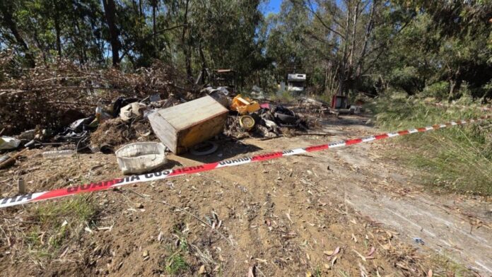 All’interno dell’area ispezionata e’ stata rinvenuta una discarica non autorizzata di circa 5.000 metri cubi di rifiuti abbandonati su una superficie di circa 2.500 metri quadrati.