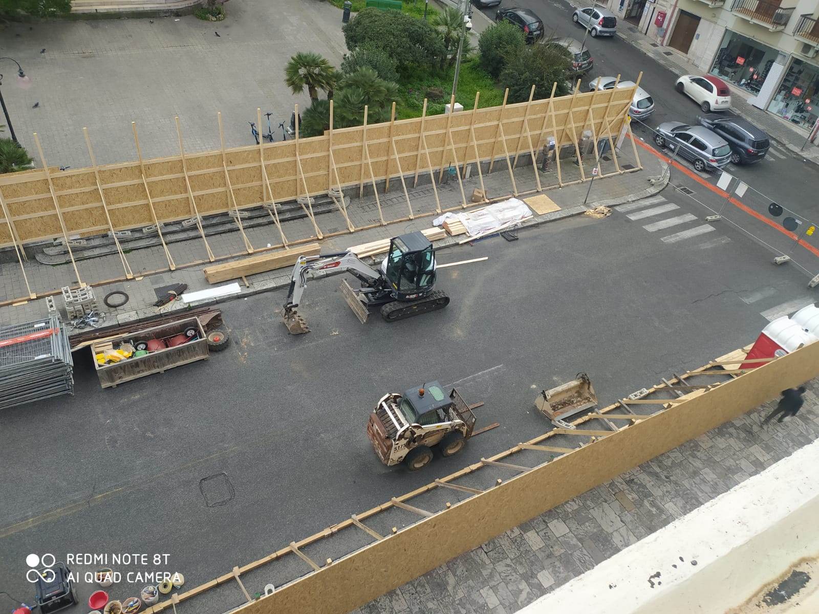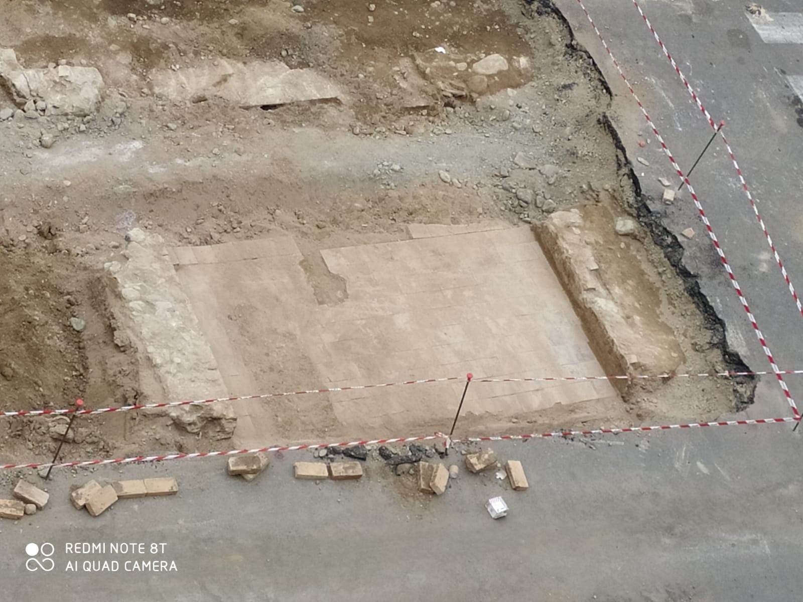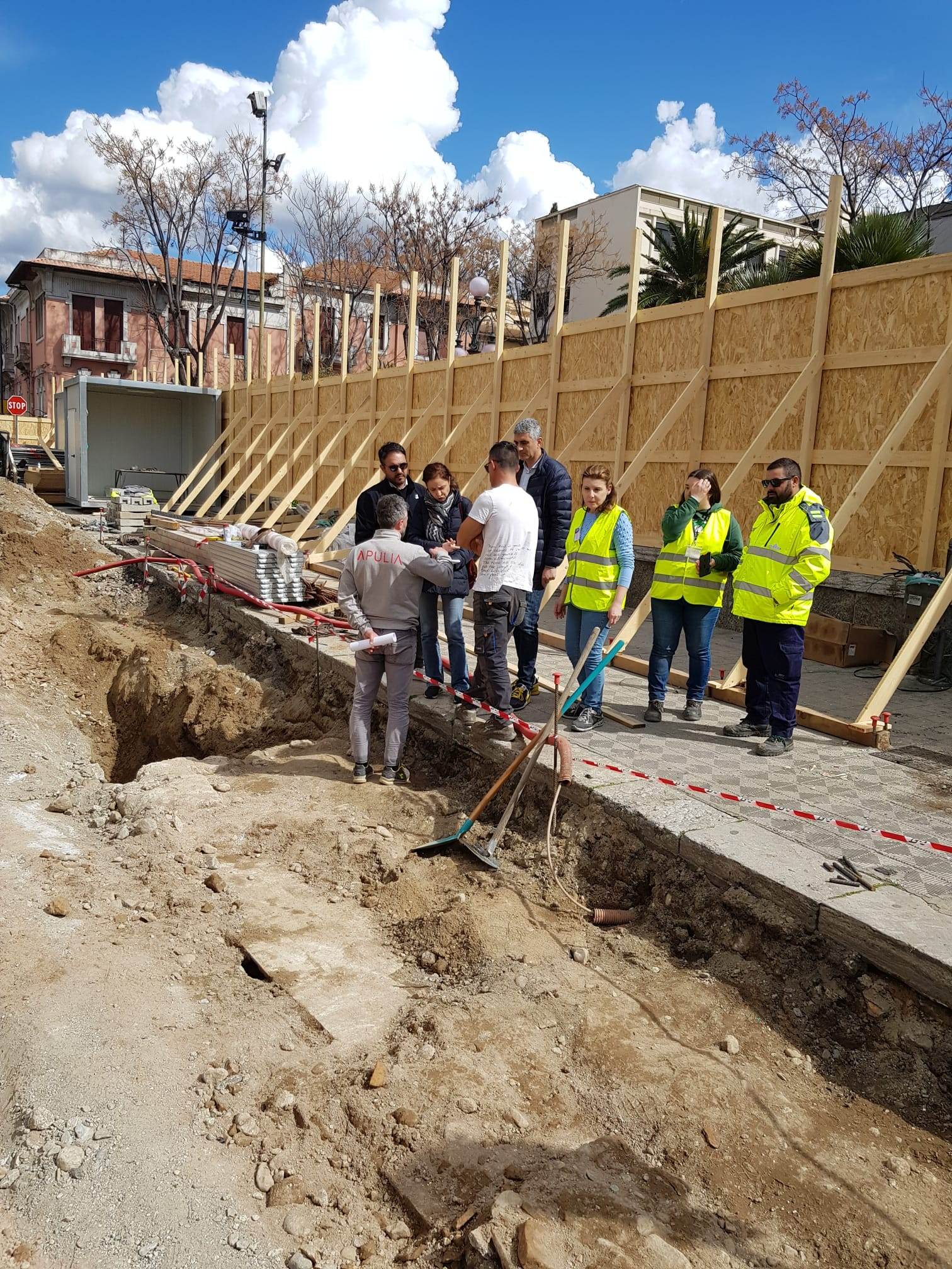 Dopo il posizionamento della recinzione di cantiere, che delimita la porzione della piazza dove sono stati effettuati gli interventi iniziali, si è proceduto con la scarifica e l’asportazione del manto stradale del tratto di Corso Garibaldi davanti al museo per raggiungere le quote di progetto e verificare la presenza del basolato storico. Al di sotto dell’asfalto sono affiorati alcuni sottoservizi e i resti di due ambienti, relativi ad una struttura otto-novecentesca già distrutta e rasata nella fase di ricostruzione edilizia di Reggio Calabria dopo il catastrofico terremoto/maremoto del 1908. Il pavimento, composto da mattonelle in terracotta e le murature sopravvissute sono state rilevate, documentate e come da prassi al fine di garantirne la tutela, sono state ricoperte con geotessuto e terreno di risulta.