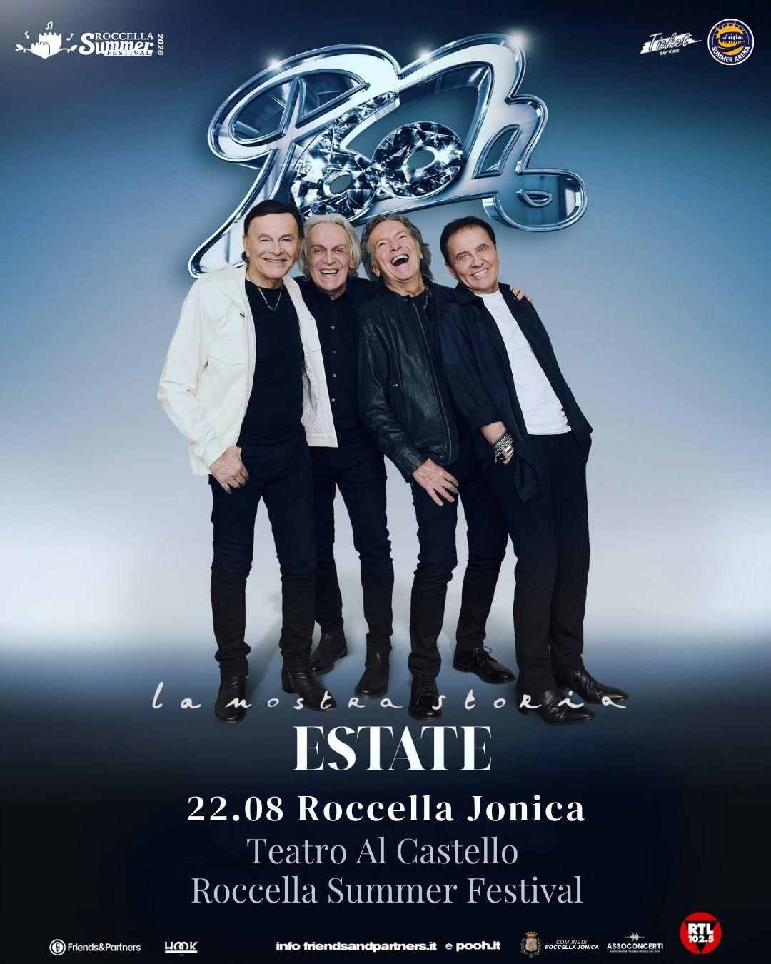 Arriva anche nella programmazione 2026 del Roccella Summer Festival “Pooh 60 – La nostra storia – Estate”, il tour estivo che porterà la grande celebrazione dei 60 anni di carriera della band nelle più suggestive location all’aperto, compresa quella al Teatro al Castello di Roccella Jonica (Rc) il 22 agosto, a partire da luglio e fino a settembre, per un nuovo capitolo di un viaggio straordinario che continua a emozionare e a rinnovarsi, trasformando ogni concerto in un evento unico e irripetibile, che ripercorre 60 anni di musica e di amicizia, 60 anni di canzoni che hanno attraversato il tempo, unendo diverse generazioni e diventando la colonna sonora della vita di milioni di persone.