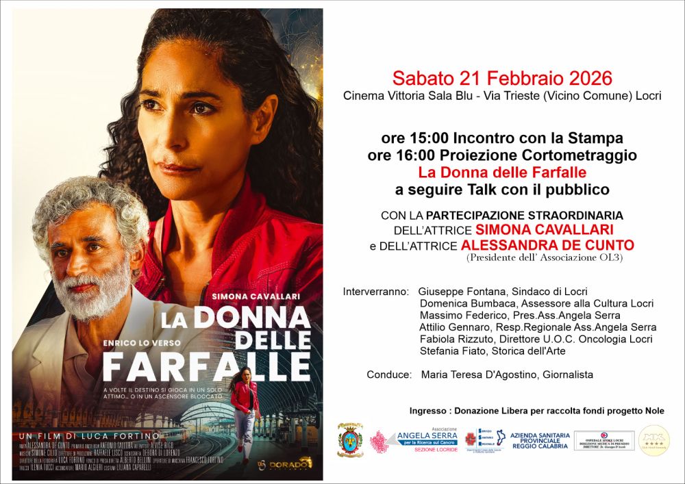 La lotta contro la malattia, la resilienza, la rinascita. Sabato 21 febbraio 2026, alle ore 16.00, al Cinema Vittoria – Sala Blu di Locri, si terrà la replica della premiere del film “La donna delle farfalle”, realizzato grazie alla collaborazione fra l’associazione OL3 e Dorado Pictures, scritto e diretto da Luca Fortino, interpreti principali Simona Cavallari ed Enrico Lo Verso, e sostenuto dall’Associazione “Angela Serra – Sezione Locride”.
