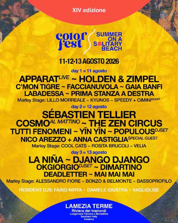 Color Fest torna per la sua XIV edizione, confermandosi come uno degli eventi musicali più attesi dell’estate italiana. Dall’11 al 13 agosto 2026, la Riviera dei Tramonti sul Lungomare Falcone Borsellino di Lamezia Terme (CZ), nel cuore della Calabria, ospiterà tre giorni di musica e condivisione, in uno dei contesti paesaggistici più suggestivi del Sud Italia.
