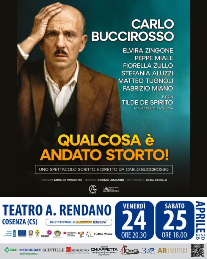 Chiusura di stagione nel segno della comicità al Teatro di Tradizione Alfonso Rendano di Cosenza per la “Rassegna L’Altro Teatro”, curata da Gianluigi Fabiano. Venerdì 24 aprile, alle ore 20.30, e sabato 25 aprile, alle ore 18.00, andrà in scena Carlo Buccirosso con “Qualcosa è andato storto”, una commedia amara e irresistibile sulla famiglia, le sue nevrosi e le sue verità indicibili.