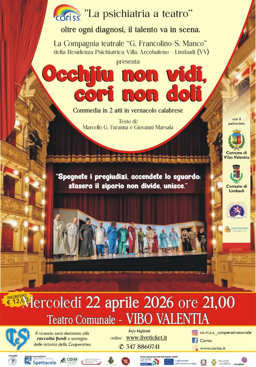 Il Comune di Vibo Valentia è lieto di patrocinare e ospitare al teatro comunale lo spettacolo “Occhjiu non vidi, cori non doli”, realizzato dalla compagnia “G. Francolino – S. Manco” della residenza psichiatrica Villa Arcobaleno di Limbadi, nell’ambito del progetto “La psichiatria a teatro – Oltre ogni diagnosi, il talento va in scena”.