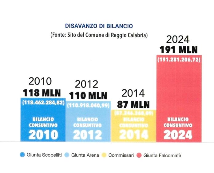 Sempre mostrando la contabilità facilmente acquisibile, il presidente di Reggio Futura passa al contrattacco: <<Guardando la deliberazione del 5 giugno 2015, la giunta Falcomatà approvava il bilancio post commissariamento. Ereditando il disavanzo, abbassato ulteriormente, di 87 milioni. Questo è il disavanzo da cui è partita la giunta Falcomatà. E lo ha portato ad oltre 191 milioni nel 2024. Quindi, ribadendo: Arena lascia un disavanzo di 110 mln, i commissari lo portano a -87, e loro lasciano a -191>>.